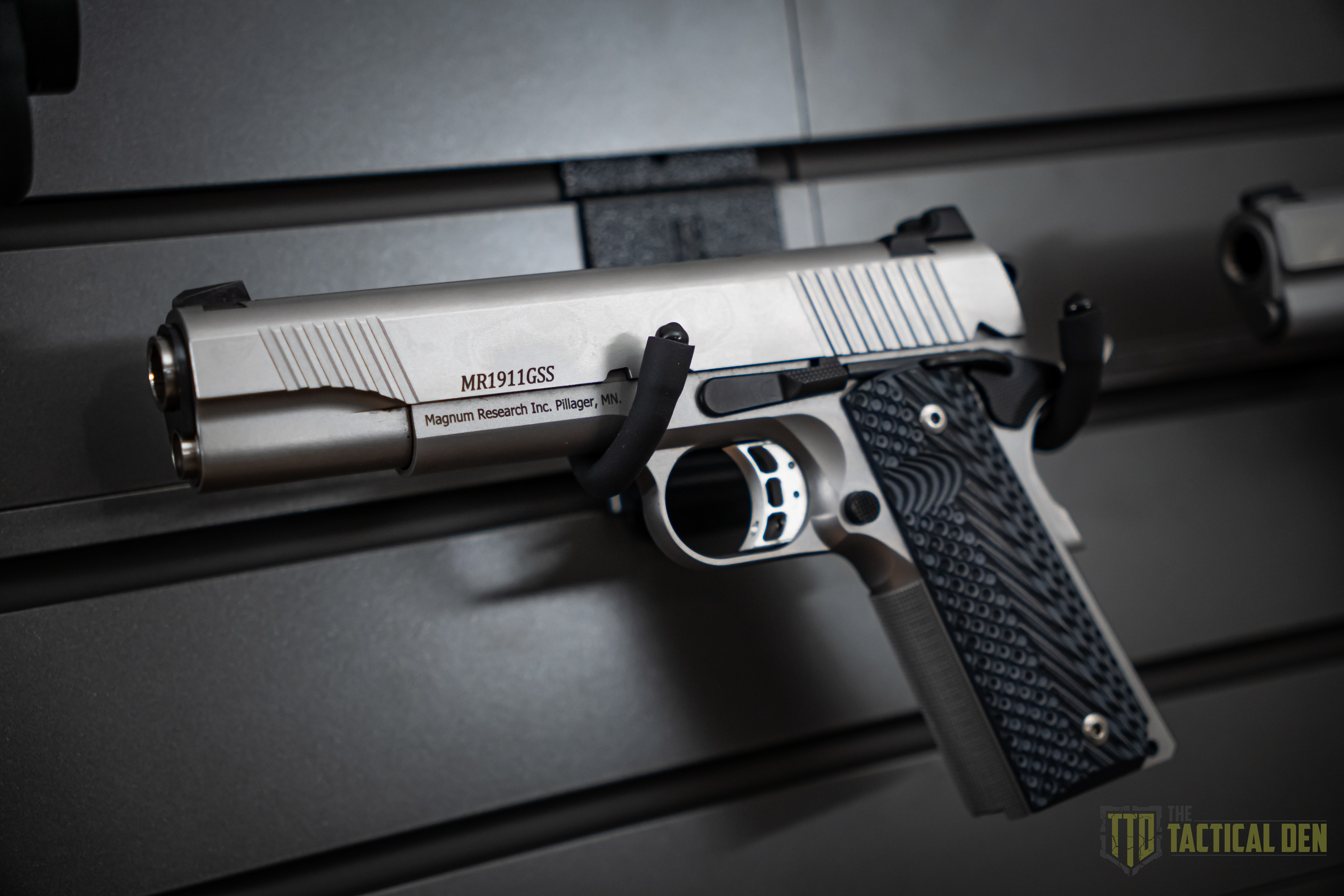 Magnum Research equips the 1911 G with a full suite of upgrades. These include a high ride beavertail grip safety, extended magazine release, aluminum trigger with an overtravel stop, skeletonized hammer, stainless full length guide rod, extended thumb safety, enlarged ejection port, a beveled magazine well, and G10 (black/grey) grips secured by stainless steel hex screws.